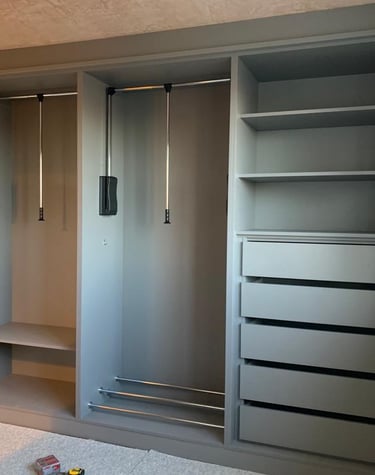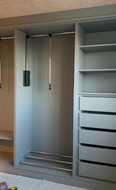 Sophisticated spaces tailored to you. With bespoke internal options we can create practical storage solutions using internal drawer packs, pull-out racks and rails, split shelving options and multiple hanging rail choices.