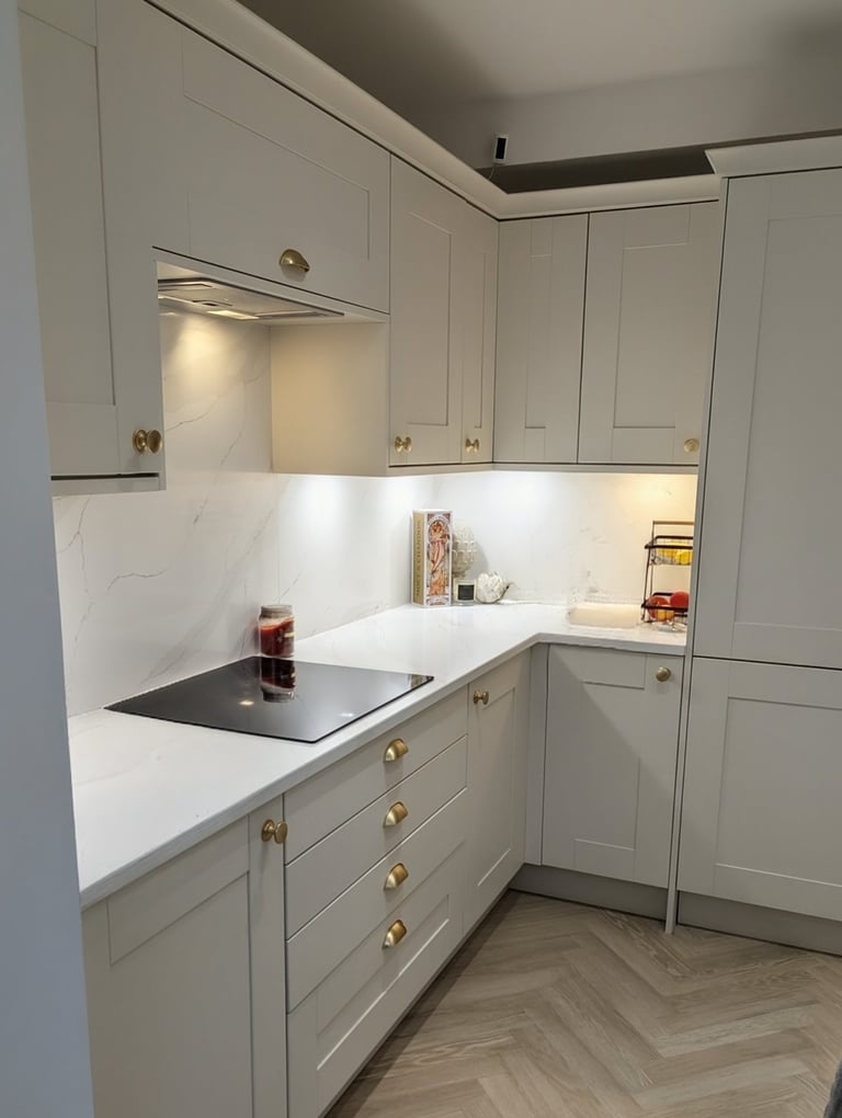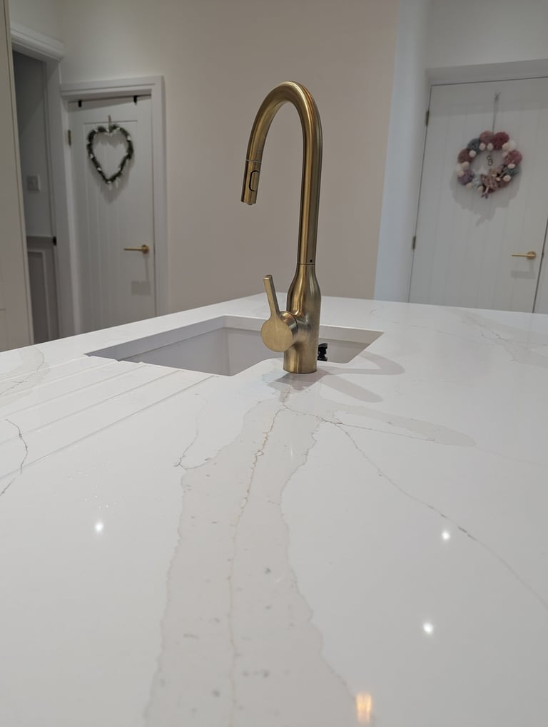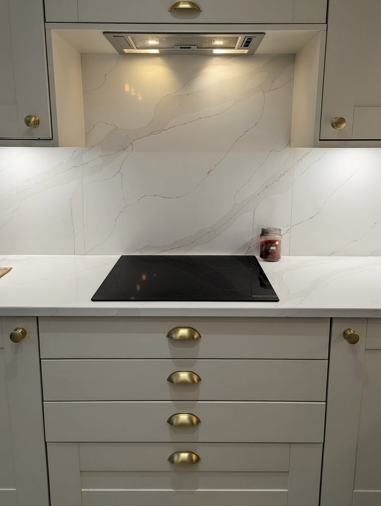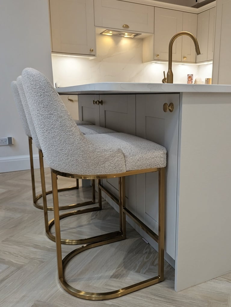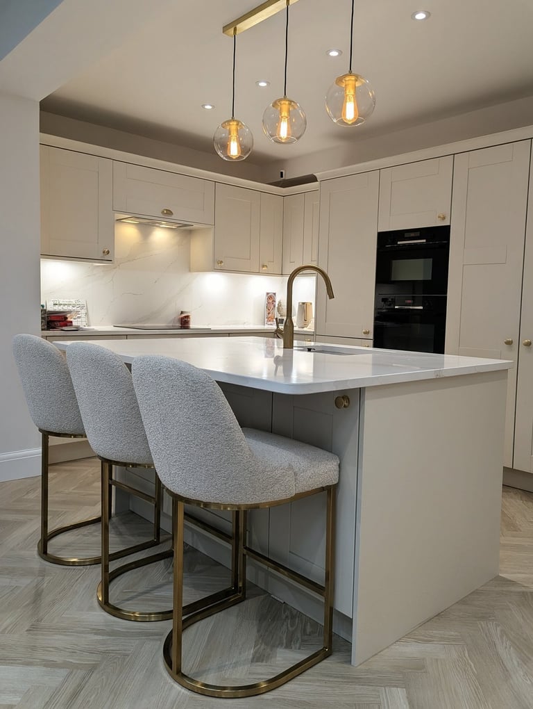 This porcelain painted shaker fits perfectly with the brass fittings and Embers quartz worktops with matching splashbacks.