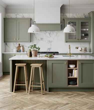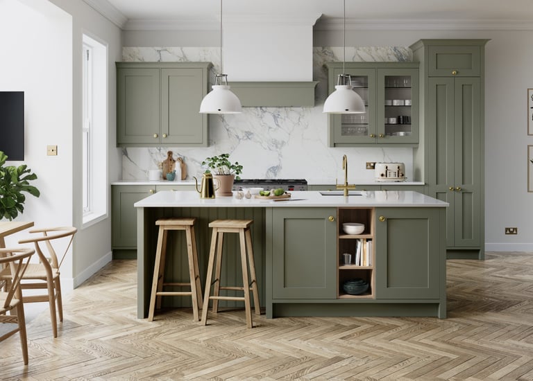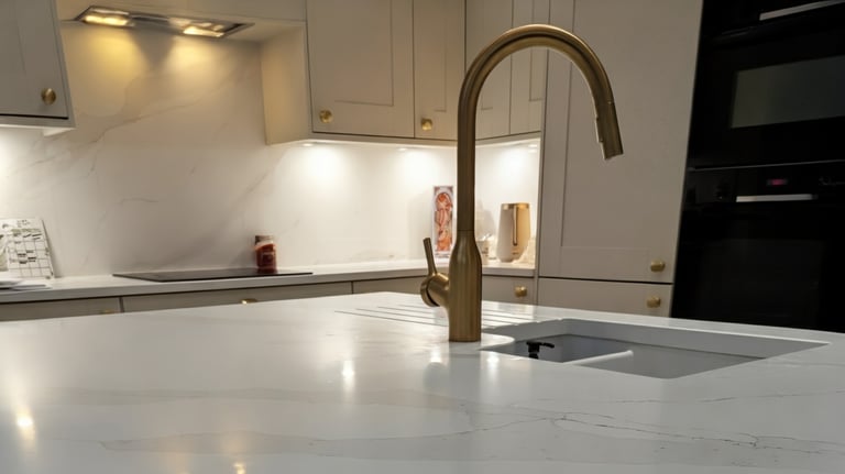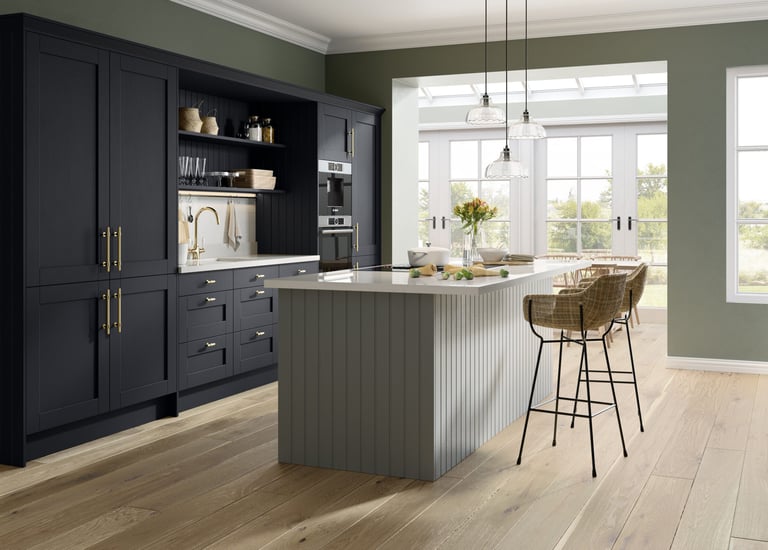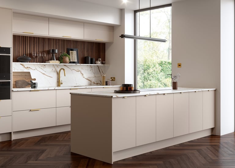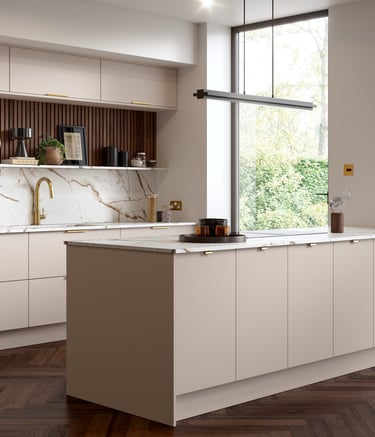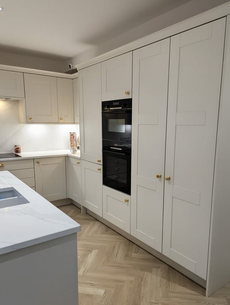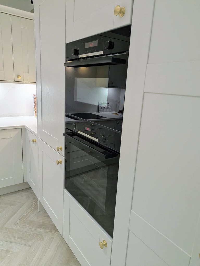 This porcelain painted shaker fits perfectly with the brass fittings and Embers quartz worktops with matching splashbacks.